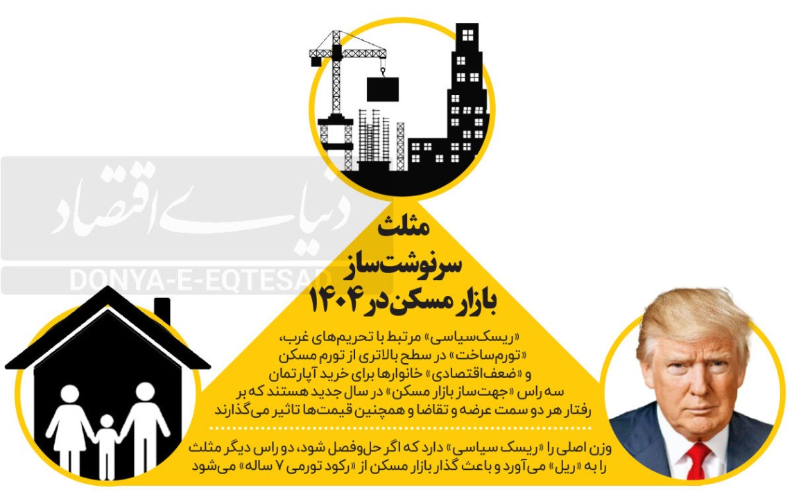 تقابل ایران و آمریکا در ماههای اخیر با روی کار آمدن دوباره ترامپ، بیش از هر زمان دیگری، به نظر میرسد. این تقابل میتواند در سال 1404 تشدید شود و در «تشدید تحریمهای نفتی» بروز پیدا کند یا برعکس، در مسیر «مذاکره» تا رسیدن به «گشایش» تغییر پیدا کند. پیشبینیهایی که برخی کارشناسان سیاست خارجی در این باره دارند آن است که «احتمال توافق کامل» پایین است اما «احتمال نوعی توافق» وجود دارد و در عین حال «احتمال تشدید تنش در منطقه» هم ضعیف به نظر میرسد.با این حال بسته به جهت احتمالی این بازیگردان اصلی بازار مسکن 1404 میتوان چهار سناریو را ترسیم کرد که همه آنها «یک فصل مشترک» دارند و آن «تداوم رکود معاملات با احتمال بالا» است.
