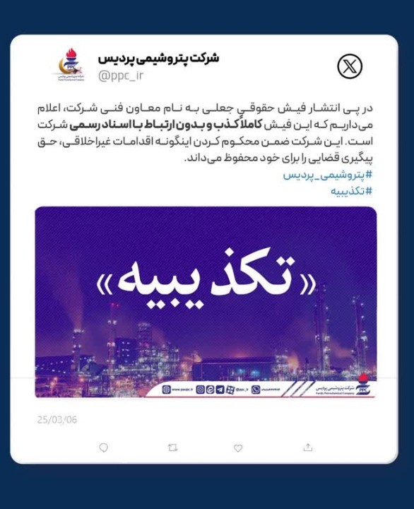 شرکت پتروشیمی پردیس ضمن محکوم کردن اینگونه اقدامات غیراخلاقی، حق پیگیری قضایی و قانونی این تخلفات را برای خود محفوظ دانسته و از مراجع ذیصلاح درخواست رسیدگی فوری دارد. همچنین از هموطنان گرامی درخواست میشود اخبار و اطلاعات را صرفاً از مجاری رسمی شرکت دریافت کنند.